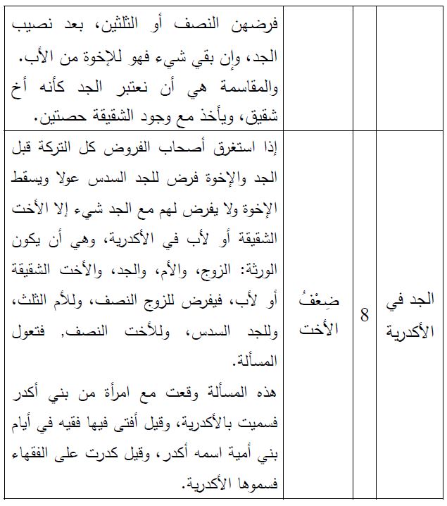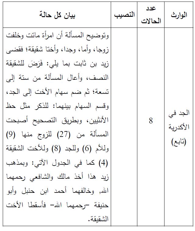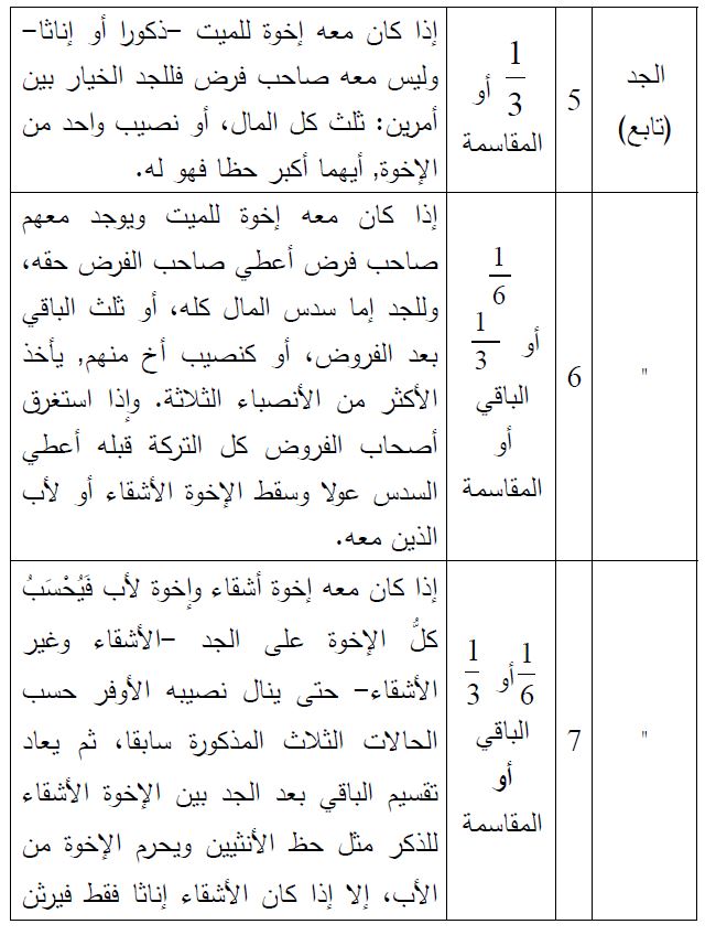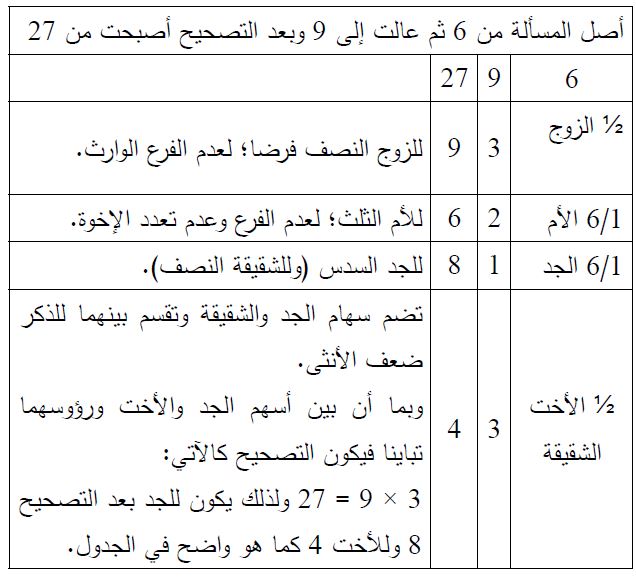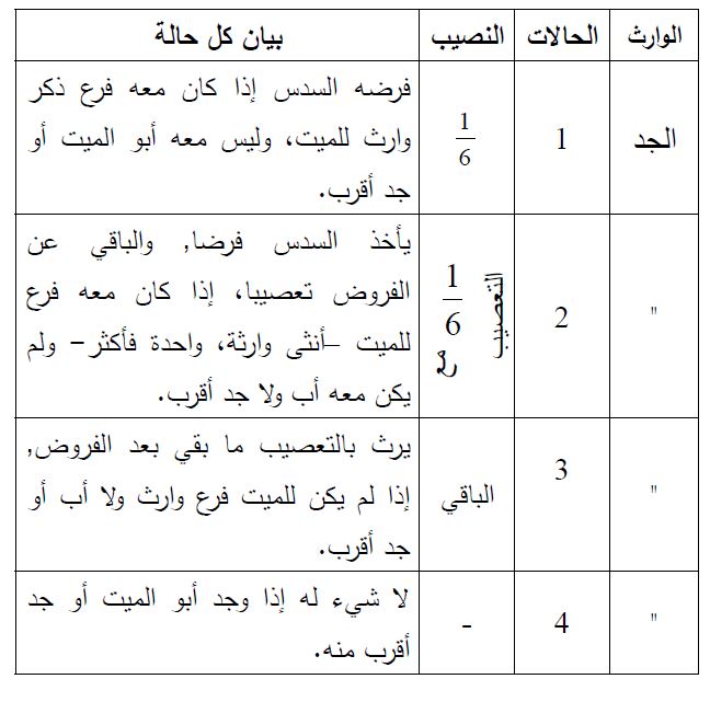 قلت: وهذا المذهب هو الصحيح وعليه التعويل. وليستخرج الحكم بسهولة في جميع حالات توريث وإليك هذا الجدول المفسر: